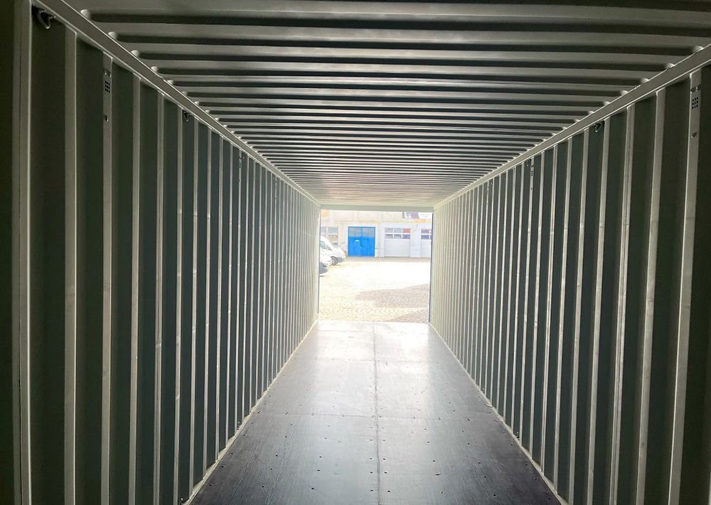 Questa configurazione unica, unita all'altezza maggiorata High Cube (2,90m), permette di caricare macchinari enormi o materiali lunghi direttamente con il muletto. Costruzione rinforzata in Acciaio CORTEN.