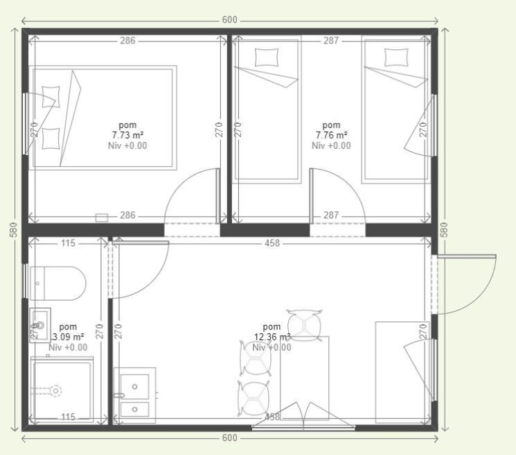- Dimensões Externas: 6,0 m (Comprimento) x 5,8 m (Largura) x 2,6/2,4 m (Altura interna).