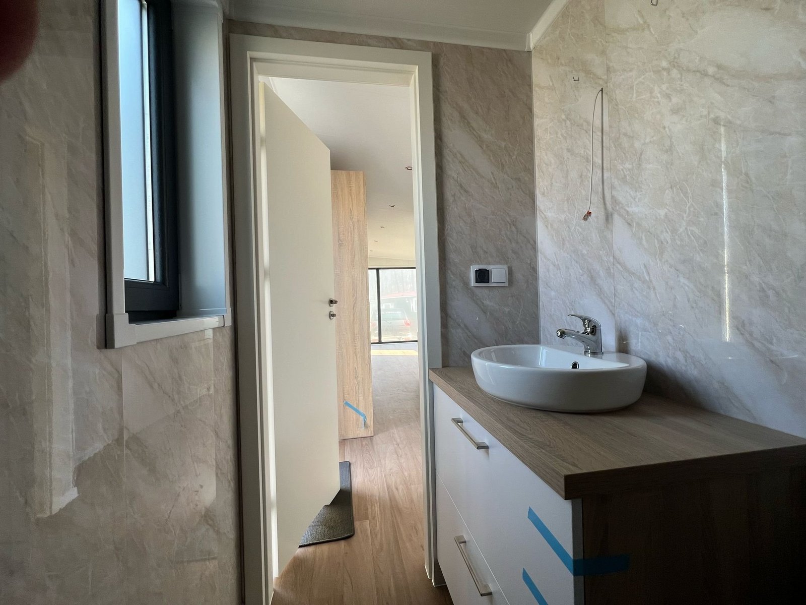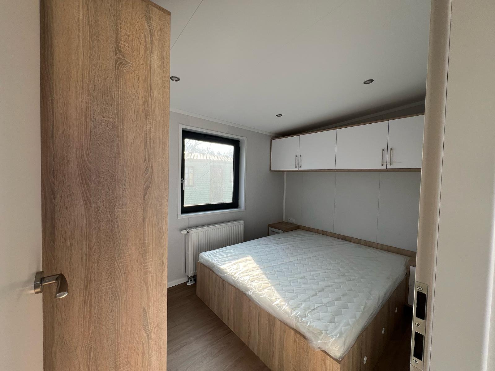 O interior é um open-space luminoso graças à grande porta de correr envidraçada. A zona de estar é decorada com tons neutros e relaxantes, enquanto a cozinha representa o coração da casa com os seus acabamentos premium. A zona de dormir e a casa de banho são projetadas para maximizar o espaço sem sacrificar o estilo, com roupeiros de ponte e detalhes de prestígio como os toalheiros aquecidos e os revestimentos com efeito pedra.