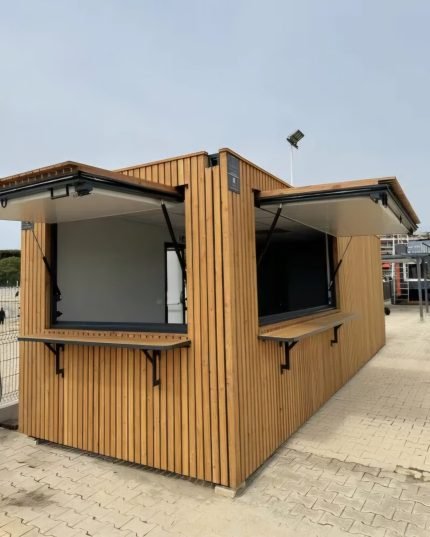Caratterizzato da ampie aperture a vasistas con pistoni a gas e banconi pieghevoli, è la soluzione ideale per Food Truck fissi, Taverne all'aperto o Uffici Vendite. Coibentato con pannelli alimentari e pronto all'uso senza necessità di fondazioni in cemento.