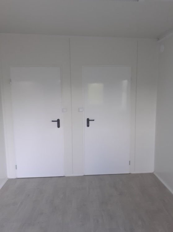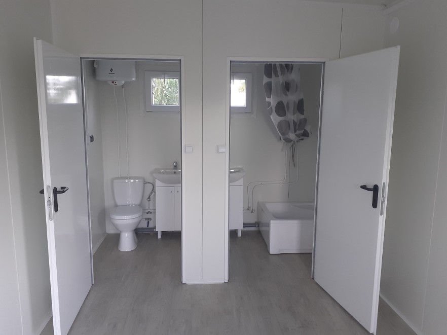 A unidade é dividida funcionalmente e acessível através de duas portas de aço isoladas, permitindo a gestão separada dos fluxos ou a divisão em zonas (ex. zona de duche/balneário e zona de sanitários). Os pavimentos em PVC e as paredes laváveis garantem uma manutenção simples e rápida.