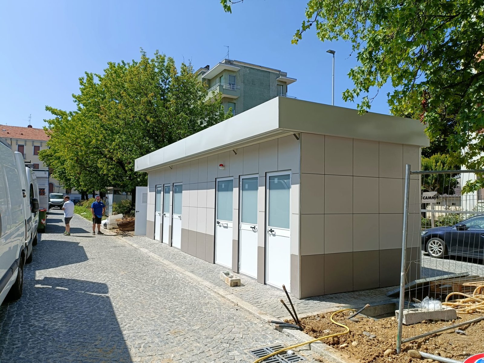 L’eccellenza per spazi pubblici e contesti di pregio. Questo Monoblocco Servizi da 10 metri si distingue per il rivestimento esterno in mattonelle HPL (finitura legno) e la struttura a doppio tetto per la massima efficienza termica.