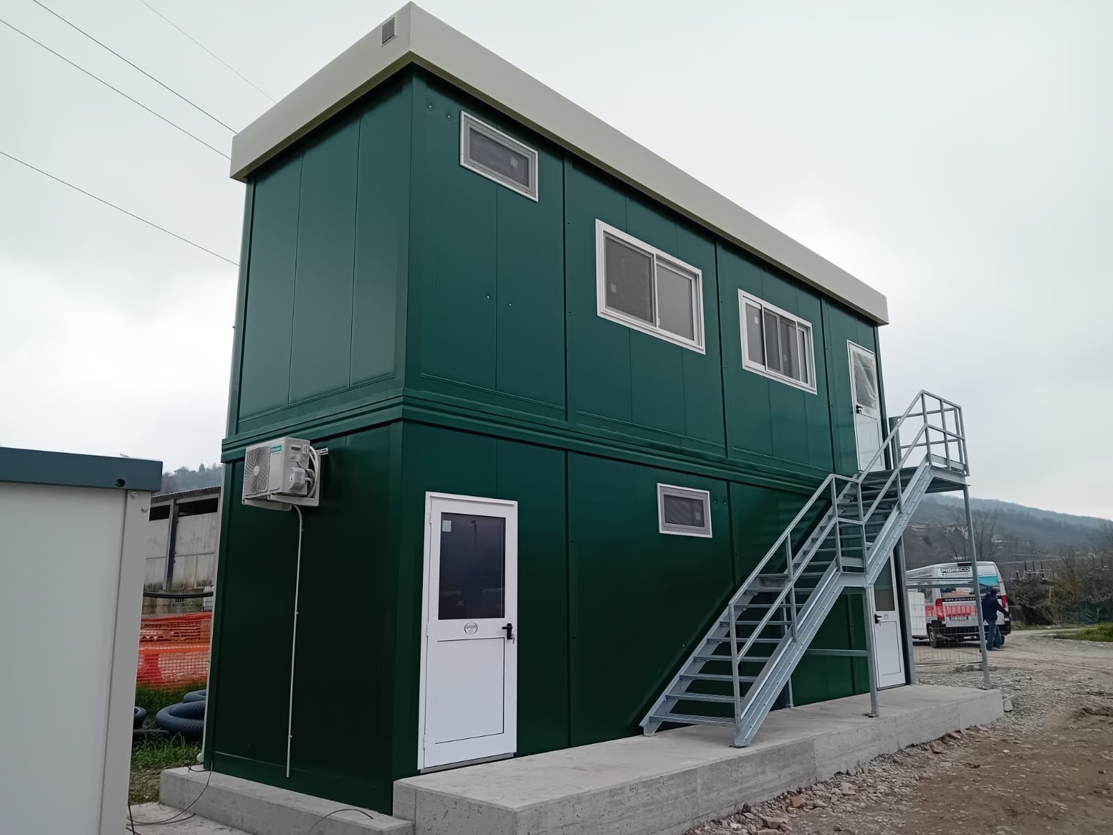 Include la progettazione strutturale e sismica per le pratiche comunali, un impianto fotovoltaico da 3kW sul tetto e finiture premium con isolamento da 100mm. Dotato di scala esterna, bagni, clima e linea vita. Colore Verde RAL 6005.
