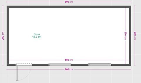 Escritório pré-fabricado 17m² com largura extra (2,9m). Isolamento térmico 100mm (U=0,38). Instalação elétrica e ventilação incluídas. Entrega imediata.